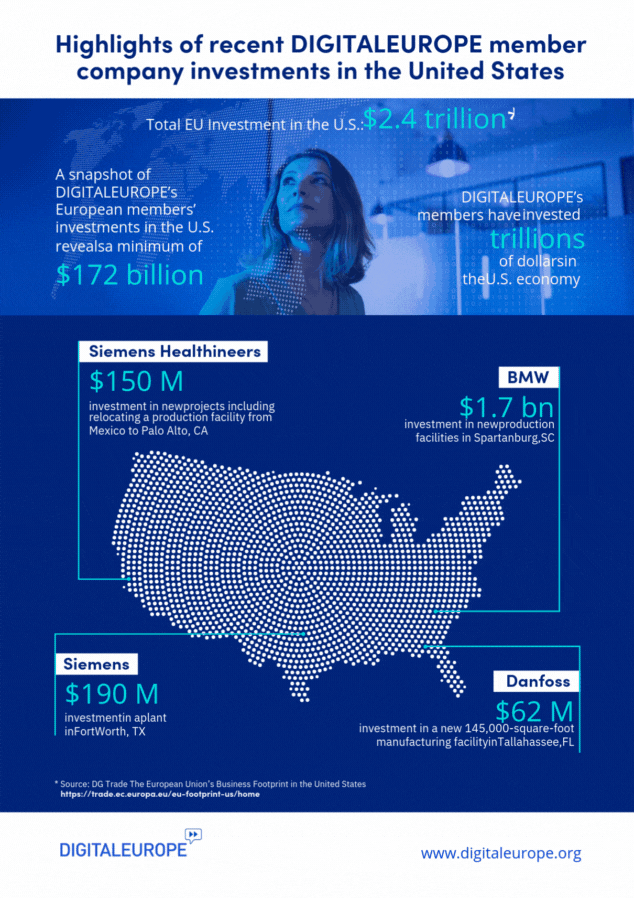 The European Union is the most important trade and investment partner to the U.S. European companies are among key investors in the US economy, and their commitment continues to grow. Our members are deepening their footprint in the U.S, including BMW’s $1.7 billion expansion in South Carolina, Siemens’ $190 million plant in Texas, Siemens Healthineers’ $150 million investment in Palo Alto, and Danfoss’s $62 million facility in Florida. Going forward, these investments are set to increase with the right framework for collaboration.
