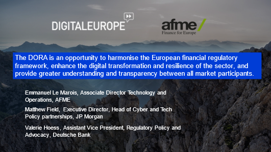 DIGITALEUROPE’s senior policy manager Vincenzo Renda moderated the discussion. But before the panels discussions were opened, AFME’s Director of Technology and Operations – David Ostojitsch – opened the roundtable, followed by a presentation of shared recommendations from both AFME and DIGITALEUROPE, voicing – in a unified way – the needs and concerns of the industries affected by DORA. These recommendations can be found here. Subsequently, the floor was given to: